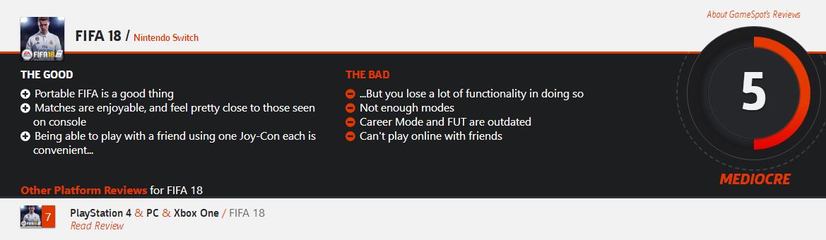 GameSpot给Switch版《FIFA 18》打出5分,游戏体验糟糕