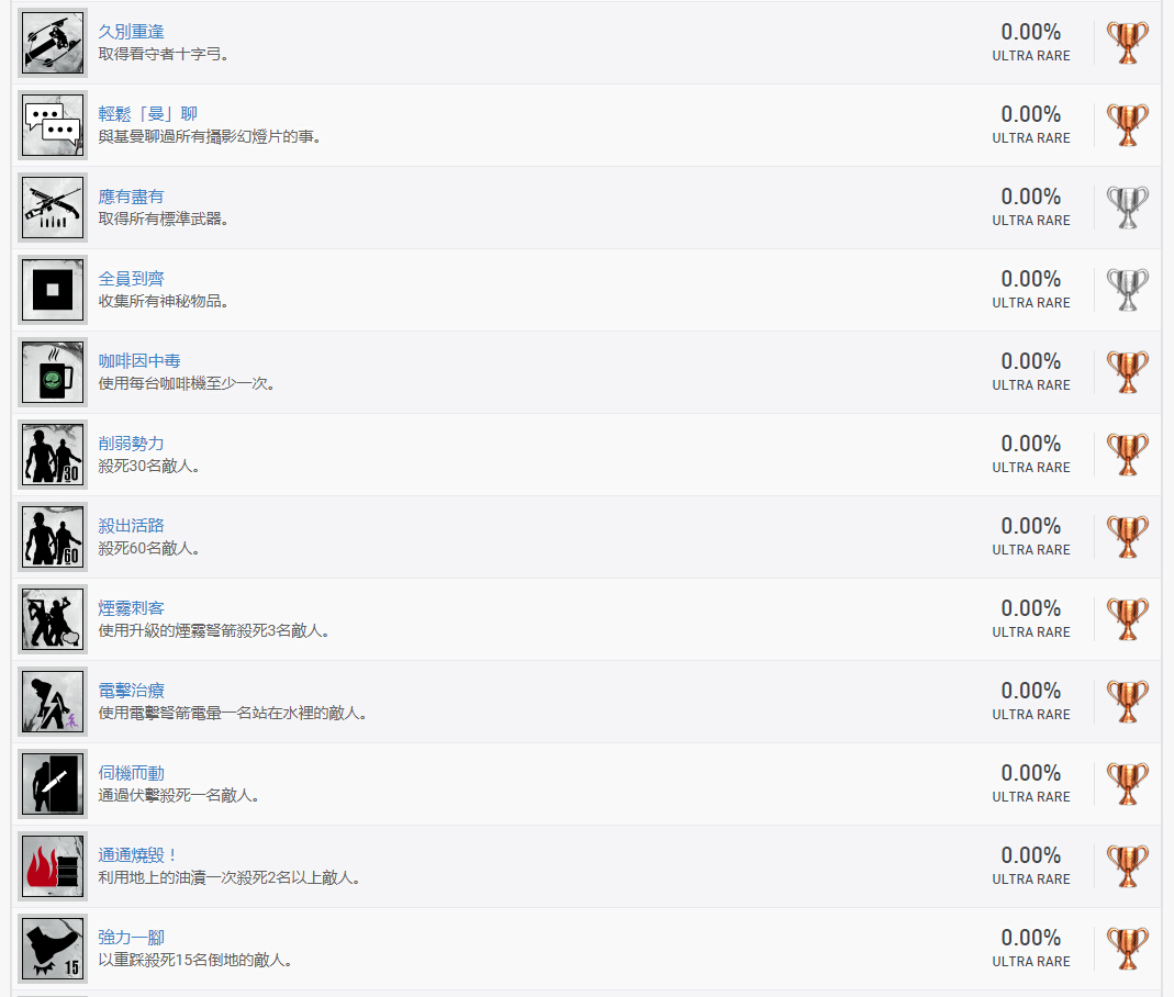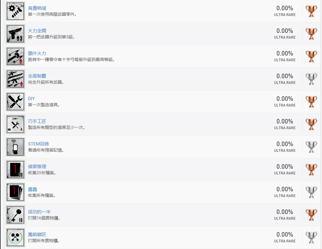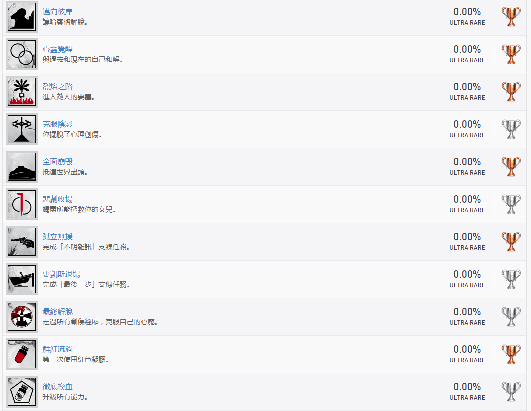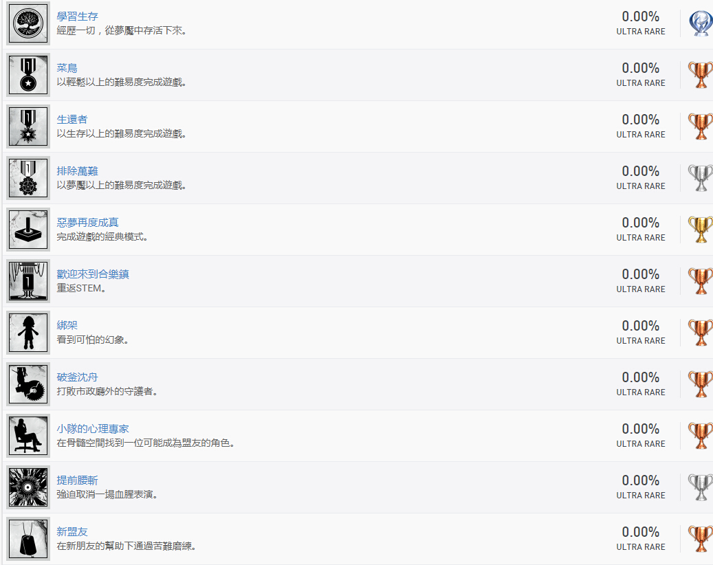 奖杯查询网站Psnprofiles今日披露了《恶灵附身2》的奖杯成就列表,本作共有36个铜杯、14个银杯、1个金杯、1个白金杯,共计52个奖杯。有意思的是其中一个奖杯的名字居然叫作“逃避不可耻又有用”,看来探戈工作室中一定有GAKKI的粉丝~PS:部分奖杯名称可能存在剧透,以上奖杯已录入游戏数据库,玩家可进入游戏详情页"奖杯"查看