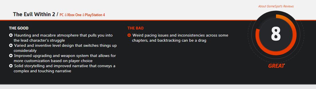 GameSpot今日为《恶灵附身2》给出了8分的成绩,相比前作的7分略有提升。GameSpot认为游戏的优点包括:缠绕心头的恐怖气氛促使玩家操纵的主角不断努力挣扎,多变的关卡设计让游戏玩起来非常不同,进化的升级以及武器系统让玩家有更多的自定义选择,进步的叙事手法以及讲故事方式让游戏的剧情表现更为突出,清楚地表达了这个复杂并且动人的故事。然而,奇怪的节奏感、不同章节间的矛盾感、以及回溯对于游戏来说是一种拖累。