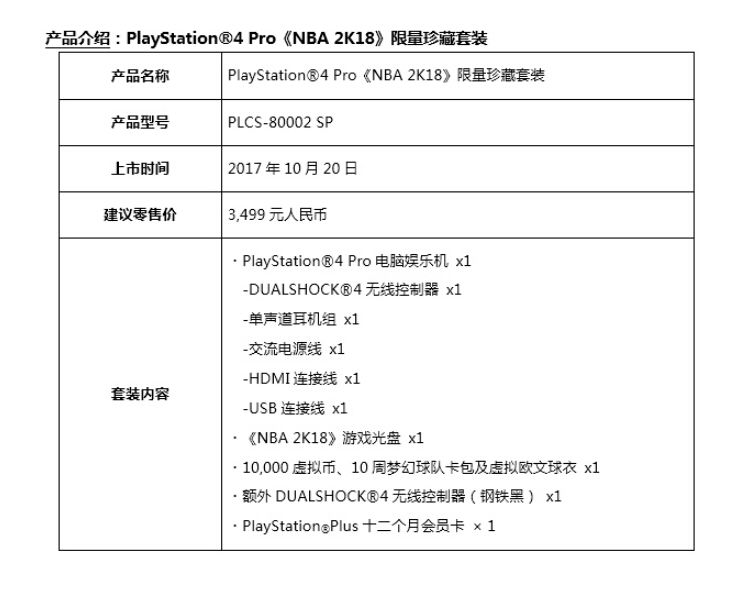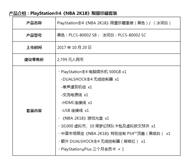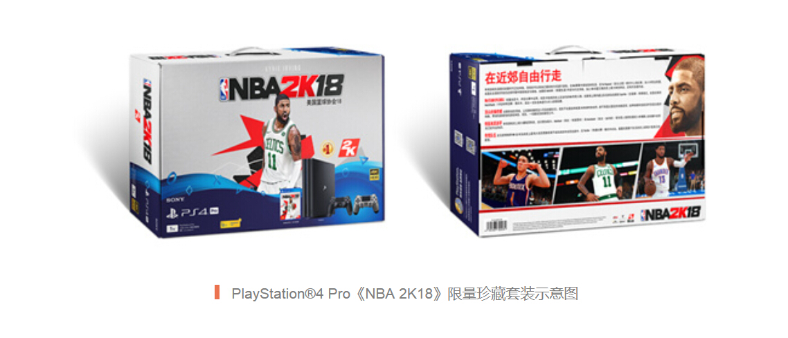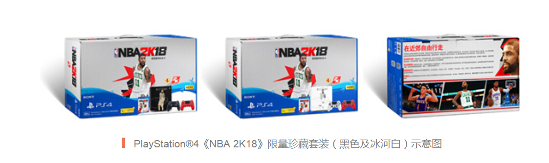 索尼中国宣布将于2017年10月20日推出PS4 Pro《NBA 2K18》限量珍藏套装、PS4《NBA 2K18》限量珍藏套装(黑色)、PS4《NBA 2K18》限量珍藏套装(冰河白)。三款套装产品除游戏本体和主机之外,还包括10000虚拟币、10周梦幻球队卡包及虚拟欧文球衣。PS4 Pro《NBA 2K18》限量珍藏套装包括额外一支无线控制器(钢铁黑)及PS+十二个月会员卡一张,售价3499元人民币。PS4《NBA 2K18》限量珍藏套装 (黑色/冰河白)包括专门为中国市场设计的《NBA 2K18》特别定制PS4顶盖一枚、额外一支无线控制器(熔岩红)及PS+三个月会员卡一张,售价2799元人民币。