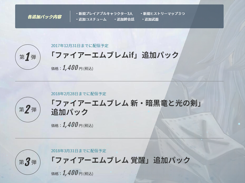 Koei Tecmo今日公布了《火焰纹章无双》全3弹DLC内容:第1弾“火焰纹章if 追加包”,2017年12月31日开放、第2弾“火焰纹章 新暗黑龙与光之剑 追加包”,2018年2月28日开放、第3弾“火焰纹章:觉醒 追加包”,2018年3月31日开放下载。以上3个DLC将包含新增可使用角色3名、新增历史地图3个、追加服装、追加羁绊会话、追加武器,售价均为1400日元。