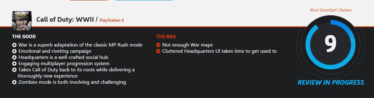 GameSpot今日为刚刚发售的《使命召唤:二战》给出了9分的先行评分。GameSpot认为这部作品在为玩家提供全新体验的同时很好地回归了《使命召唤》系列的本源;游戏拥有富有感染力且引人入胜的战役剧情;僵尸模式也同样具有挑战性;由经典的多人Rush模式改造的战争模式非常出色,特别是多人模式中逐渐推进的环节非常出彩;指挥部系统也为玩家提供了一个很好的社交场所;本作的缺点在于游戏初期没有提供足够多的战争模式地图,指挥部的UI界面过于杂乱需要适应。本次对于多人模式的评价都是基于动视在此前提供的多人测试环境,在多人服务器正式上线之后GameSpot会对本作的多人模式做出更多的测试。