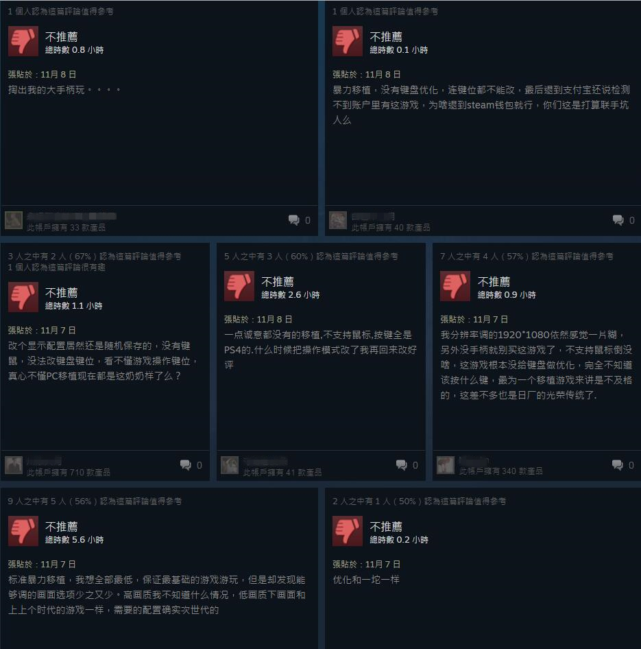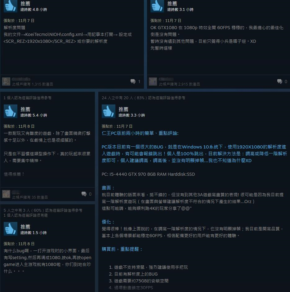Steam平台上的《仁王 年度版》已于昨日正式发售,根据SteamSpy的数据,本作的全球持有量在8315份左右,而目前本作在Steam上的评价为“褒贬不一”,好评率为69%。根据商品下方评论,大部分玩家认为本作的优化水平尚可,主流配置都能够流畅运行,并且本作价格也在可接受的程度内;主要玩家给出差评的理由在于,游戏运行经常出现报错、白屏、跳出等问题,手柄按键设置不对应、键盘操作优化差以及无法使用鼠标操作等。特别是游戏中手柄对应按键为PS4按键并且修改按键后游戏内的“按键提示”无法适配等问题让许多玩家纷纷吐槽本作是一款“暴力移植”的作品。至于许多玩家反映的分辨率问题可以在右键游戏的启动器里进行设置。