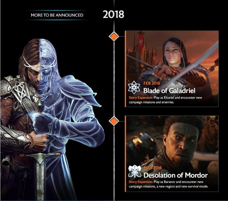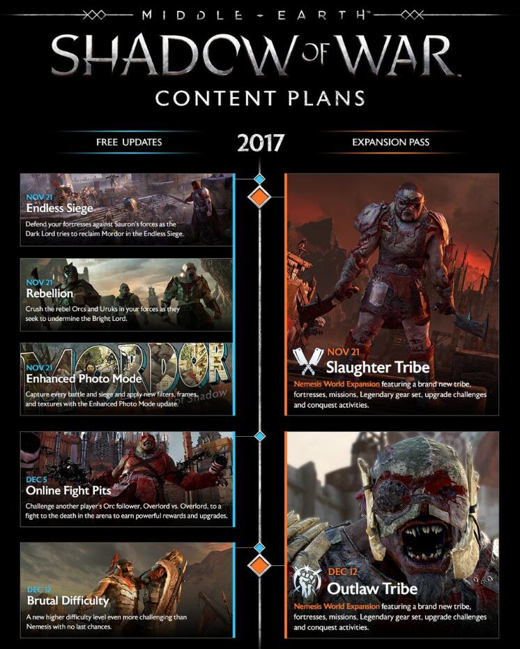 华纳兄弟旗下的《中土世界:战争之影》今日公布了游戏的5款免费更新内容。首先在11月21日,游戏将加入“无尽围攻”、“反叛”和“增强摄影模式”三款内容。12月5日,玩家可以通过新加入的线上斗技场与其他玩家一试身手。12月12日,游戏将加入更高的难度。在2018年也会有更多的免费内容到来。除此之外,购买季票的用户,可以在今年的11月21日和12月12日迎来“屠杀部落”和“亡命部落”两个更新,在2018年的2月和5月,游戏将加入“加拉德里尔之刃”和“摩多的衰败”两款新内容。