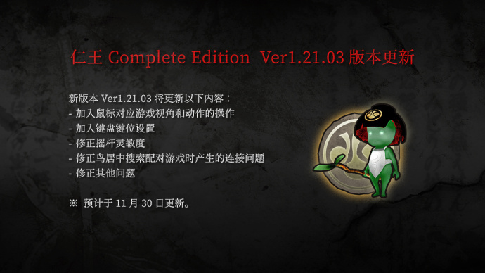 KOEI TECMO宣布Steam版《仁王 完整版》最新的更新将于11月30日上线,更新将加入鼠标对应游戏视角和动作操作支持、加入键盘键位设置、修正摇杆灵敏度、修正鸟居中搜索配对游戏时产生的连接问题等。