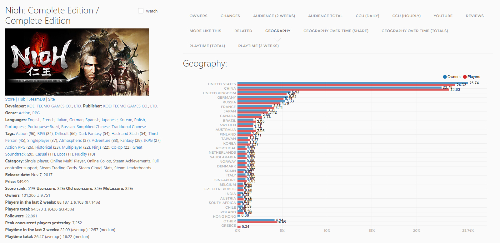 【口嫌体直?】自从Steam版《仁王 完整版》公布以来,本作一直是玩家们口诛笔伐的“焦点”。目前Steam版《仁王 完整版》已经发售有20天了,目前全球销量为101206 ± 9751,其中国区销量仅次于美国区,并且国区与美国区的各自销量都要远远高于其他地区。