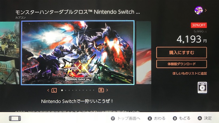 目前《怪物猎人XX》的Nintendo Switch版正在日服eShop以7折促销销售中,折后仅售4193日元,合人民币约246元,有兴趣的玩家可以购买。