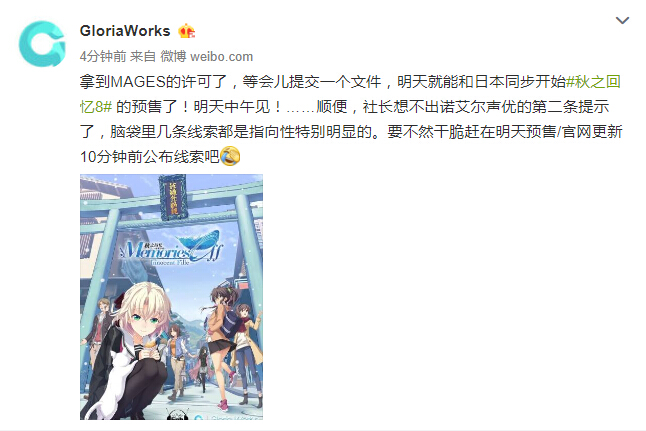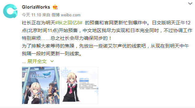 《秋之回忆8 无垢少女》中文版将于北京时间明天中午12点开启预售