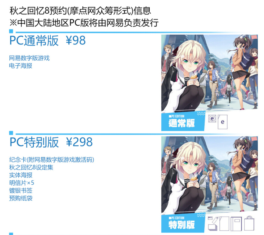 GloriaWorks宣布PS4/PSV/PC《秋之回忆8 无垢少女》中文版预约将在摩点网上进行,PC通常版售价98元,PS4/PSV通常版售价348元。完全限定版售价3488元(限量100份),其中包含游戏本体、秋之回忆8设定集、全系列画集、全系列完全原声集、全新绘制超豪华镜框挂画(附带原画师签名+专属序列号)、实体海报、明信片X5、镀银书签、预购纸袋、圣地巡礼纪念册、立牌、6人组盒蛋。目前暂不确定中文版发售日是否和日版同步。