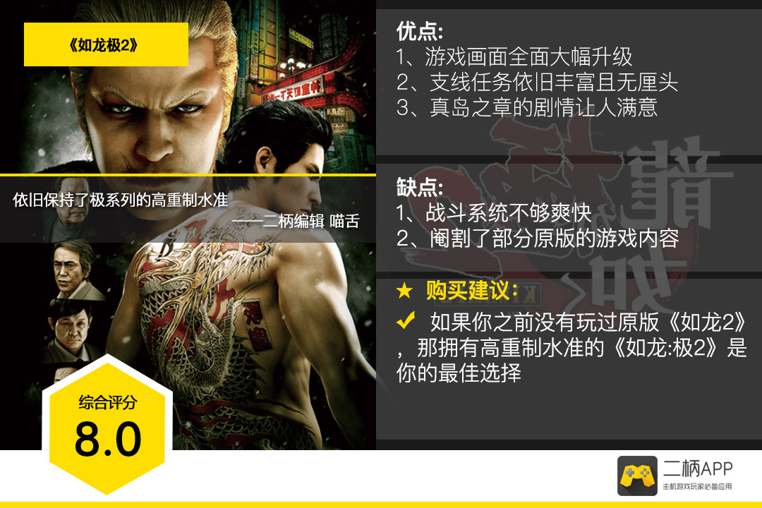 《如龙:极2》依旧保持了极系列的高重制水准,并且无论是主线剧情,还是夜店/真岛建设模式也都请来了一众日本明星,加上丰富且剧情无厘头的支线任务,以及大量不同类型的迷你游戏,如果你之前没有玩过原版《如龙2》,那拥有高重制水准的《如龙:极2》是你的最佳选择。