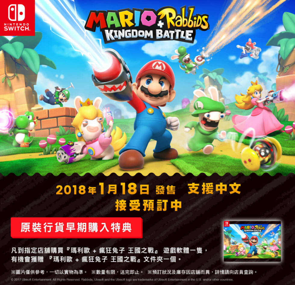 任天堂香港宣布,Switch游戏《马里奥和疯狂兔子:王国大战》的官方中文版(港版)将于2018年1月18日推出,早期购入特典为《马里奥和疯狂兔子:王国大战》主题文件夹(数量有限,送完即止)。