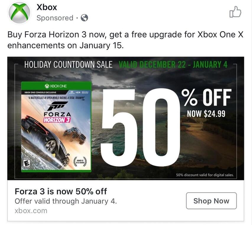 近日网友发现,微软在社交网站上打广告推送《极限竞速:地平线3》的优惠促销,在2018年1月4日之前本作都将进行五折优惠。同时信息还显示微软将在1月15日推送该作的Xbox One X升级补丁,对画面进行强化。据之前的信息显示,画面增强补丁将为《极限竞速:地平线3》带来原生4K分辨率以及HDR支持。