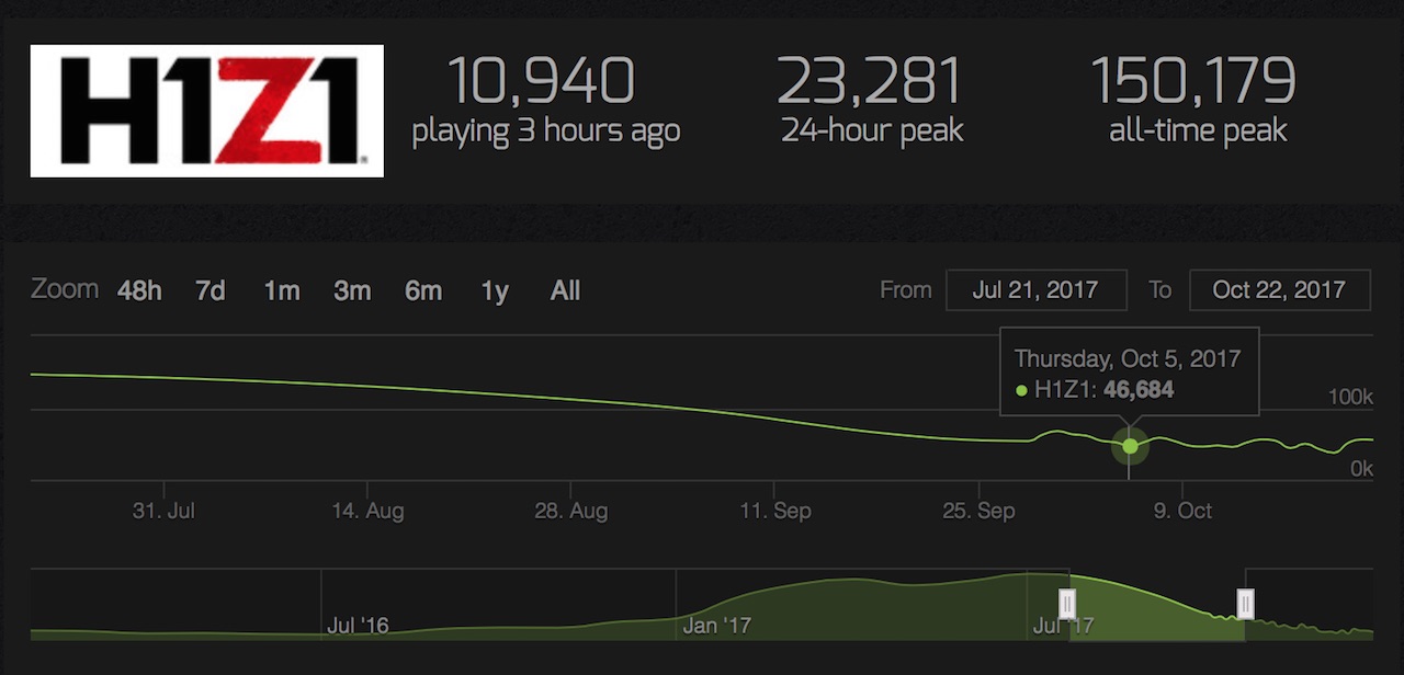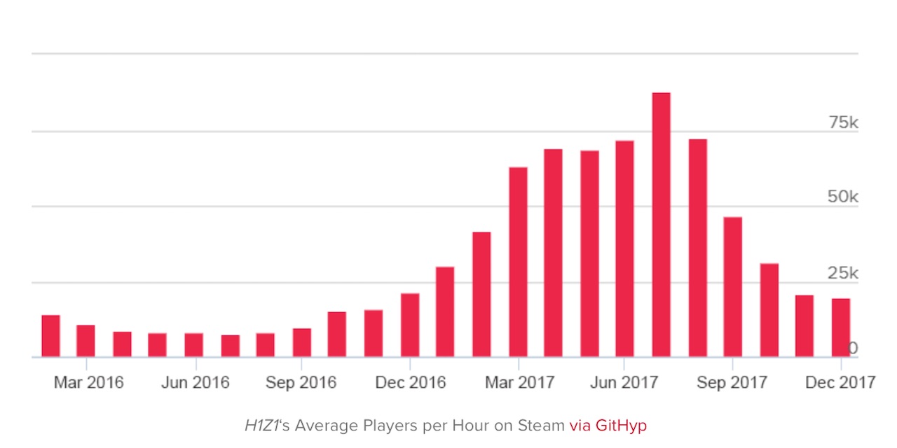 据GitHyp数据分析Daybreak Game旗下游戏《H1Z1》的平均登陆用户数在过去的5个月内减少了78%。