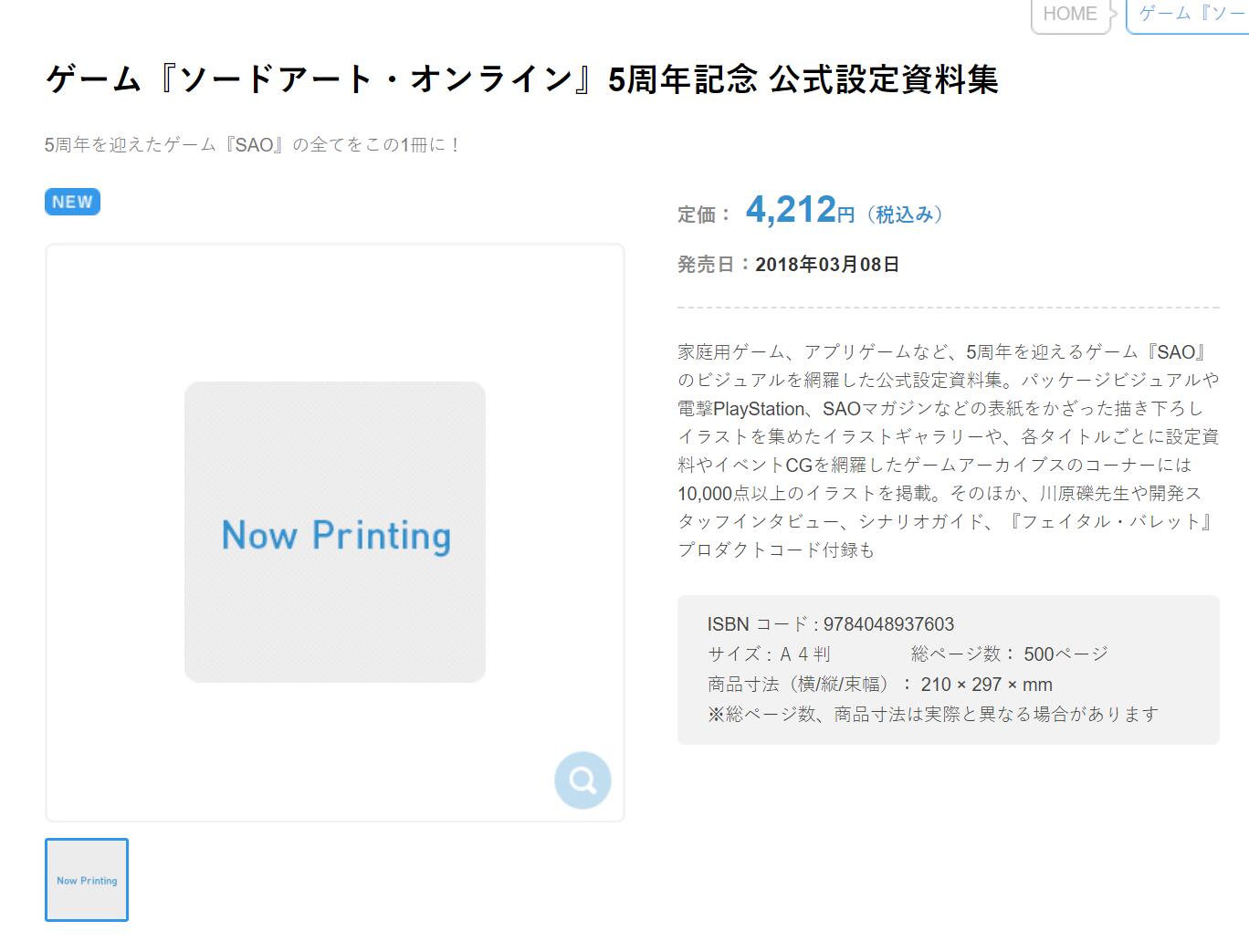 角川宣布将推出《刀剑神域》游戏系列5周年纪念公式设定资料集,其中包含了《刀剑神域》主机平台游戏与移动平台游戏的设定资料等内容,总页数达到500页,该设定资料集将于2018年3月8日发售,售价 4212日元。