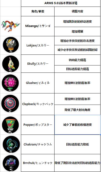 任天堂今日为格斗游戏《ARMS》追加了5.01版本的更新,本次更新对一些角色以及拳套的性能做出了调整,具体调整内容见下图。