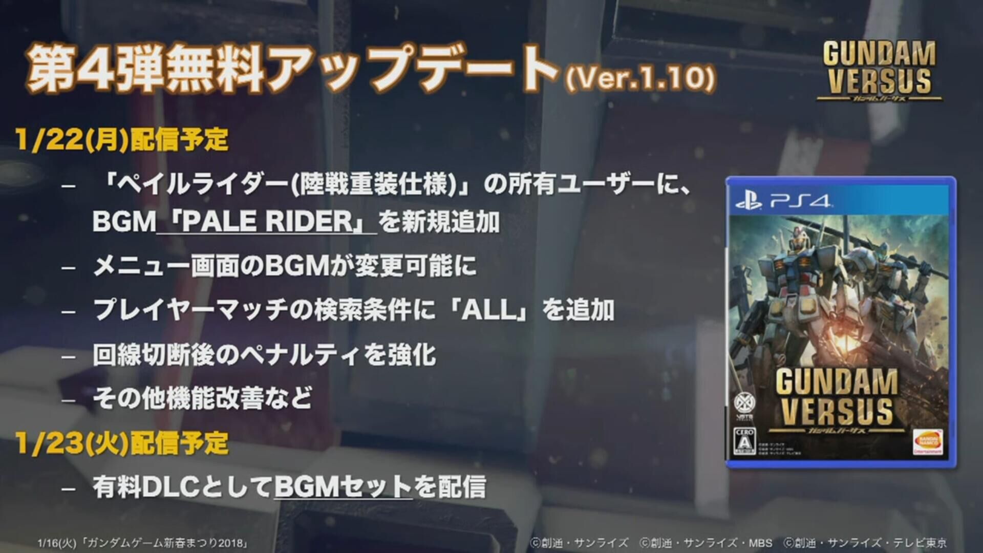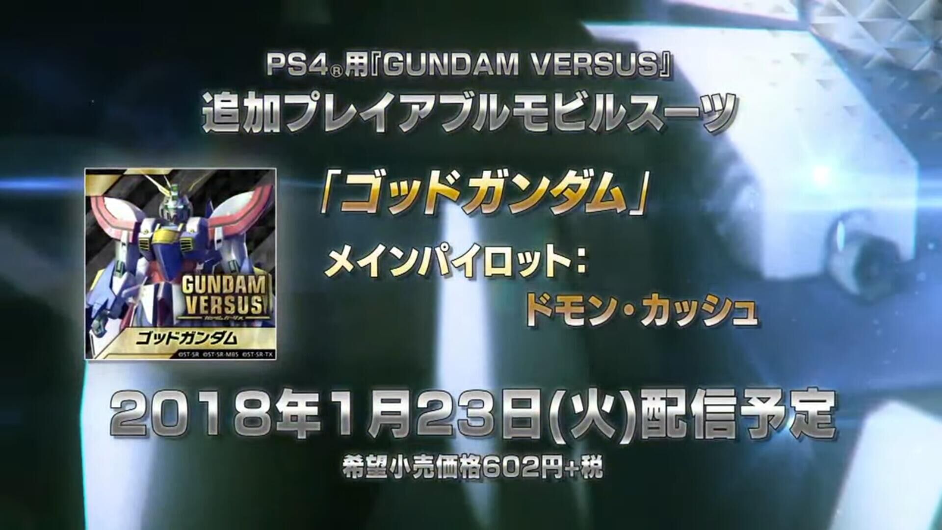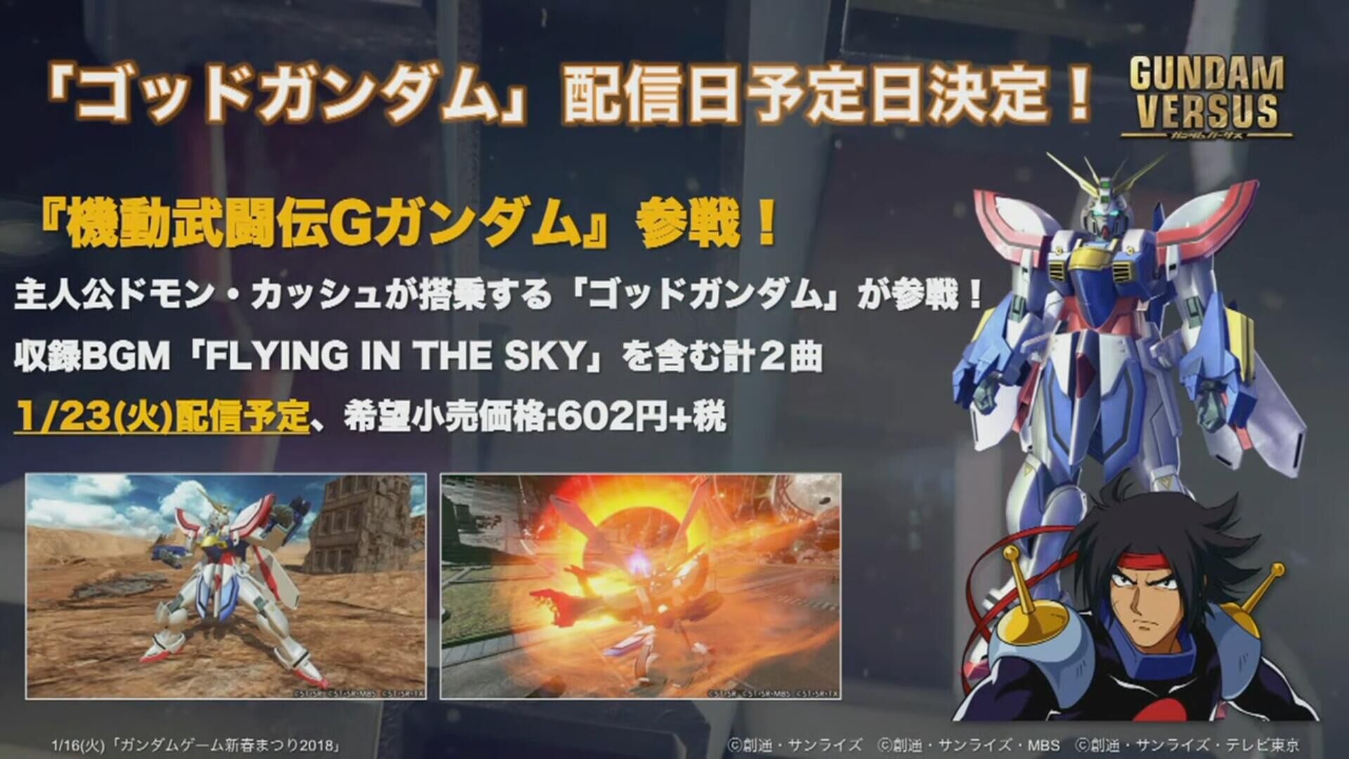 《高达VERSUS》第四弹免费更新公布,包含主菜单页面可以更换BGM、玩家比赛搜索条件增加“ALL”等。此外《机动武斗传G高达》中的“神高达”和“尊者高达”将于2018年1月23日推出,均售价602日元+税。
