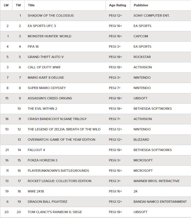 数据显示,PS4《旺达与巨像》重置版发售以来,首周实体游戏销量比当年PS2的原版高出73%,并且在本周成为英国游戏销量榜冠军。这与游戏本身的高素质密不可分。此外在全球出货600万以后,《怪物猎人:世界》在本周榜单中排名第三。《使命召唤:二战》自上市以来跌出前五,位居第六名。EA的《UFC3》和《FIFA18》位居第二和第四名,第五名为RockStar的《横行霸道5》。