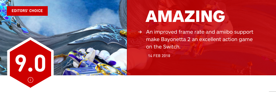 IGN和GameSpot今日分别为Switch平台的《猎天使魔女2》给出了9分和10分满分的高度评价。IGN认为相对于之前的Wii U版本,游戏在Switch上的帧数表现有了很大的改善,大部分场景能够基本维持在60帧;而Amiibo服装的支持也为游戏添加了很大的趣味性,很可惜游戏只能在720p的分辨率下运行,不过游戏拥有的独特的艺术风格等优点仍足以让人沉迷其中;GameSpot认为游戏有着富有深度却易于上手的战斗系统以及惊心动魄的BOSS战;跌宕起伏动感十足的游戏节奏;华丽的视觉效果和角色设计;游戏包含了大量的解锁、挑战和解谜要素。而非常有意思的是,GameSpot给出的缺点为“遗憾的是,之后的动作游戏恐怕无人能出其右。”