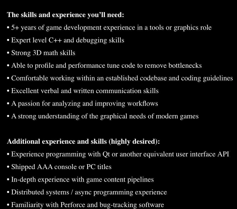 今年的《使命召唤》新作将由Treyarch来制作,而目前T组正在招募一位“高级核心技术工程师”,他们希望这一职位的应聘者可以为系列新作的引擎带来全新的图形特性,并为游戏的指令集和渲染管线带来新的突破,并且这一职位将会直接参与到T组“下一款销量大作”的开发当中。毫无疑问目前Treyarch正在为《使命召唤》新作的图形技术提升寻求人才,有兴趣的玩家可以参考配图了解T组对于这一职位的技术需求。