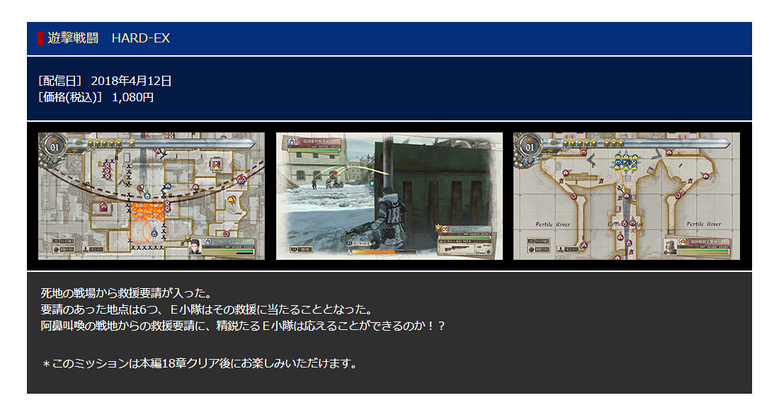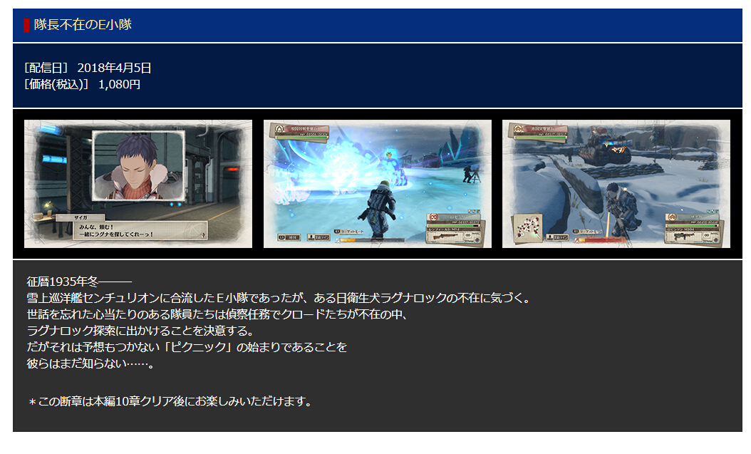 SEGA公布了PS4版《战场女武神4》DLC内容,第一弹DLC“E小队向海边出发!”将于2018年3月29日发售,售价1620日元(约96元人民币);第二弹DLC“队长不在的E小队”将于2018年4月5日发售,售价1080日元(约64元人民币);第三弹DLC“游击战斗 HARD-EX”将于2018年4月12日发售,售价1080日元;第四弹DLC“两名女武神”将于2018年4月19日发售,售价1620日元。而包含以上全部DLC的季票会在今日推出,售价4320日元(约256元人民币)。