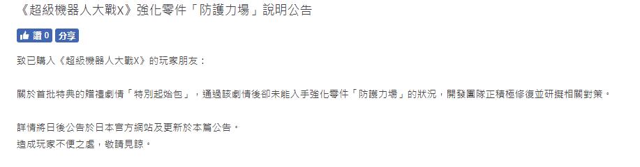 购买了PS4/PSV游戏《超级机器人大战X》的玩家可以在通过首批特典的赠礼剧情「特别起始包」后,获得强化零件「防护力场」。不过目前有玩家反馈称,在通过指定剧情后仍无法获得该零件,对此Bandai Namco官方发文称已经收到该情况反馈,开发团队正积极修复该BUG。
