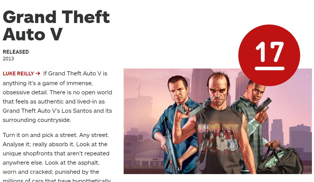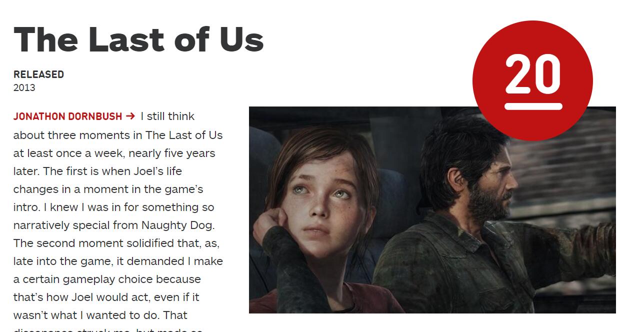IGN今日公布了史上TOP100游戏榜单中前20名的具体名单,依次为《超级马里奥世界》、《塞尔达传说 时之笛》、《传送门》、《超级银河战士》、《塞尔达传说 众神的三角力量》、《超级马里奥兄弟3》、《俄罗斯方块》、《半条命2》、《荒野大镖客 救赎》、《超级马里奥64》、《传送门2》、《恶魔城X 月下夜想曲》、《光环 战斗进化》、《超级马里奥兄弟》、《街头霸王2》、《黑暗之魂》、《横行霸道5》、《时空之轮》、《毁灭战士》、《最后生还者》。