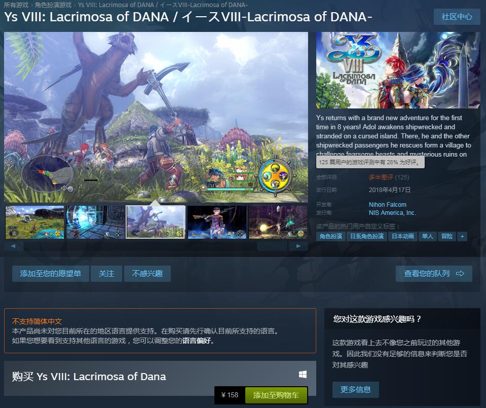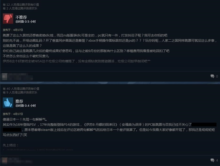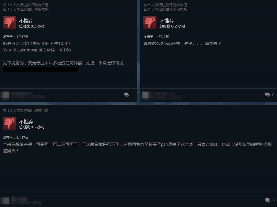 Steam版的《伊苏8:丹娜的陨涕日》终于在今日凌晨解锁,但从目前Steam上的评价来看,许久的磨砺不但没有讨到粉丝们的欢心,反倒招致了一片差评。目前本作在Steam上好评率仅为25%。玩家反映的问题主要集中在游戏优化差,帧数低且不稳定,跳出闪退等各种Bug频繁出现,手柄映射经常出错等,有的玩家甚至因为频繁跳出而不能完成序章任务。但是大多数玩家认为游戏质量本身并没有太大的问题,而把责任归咎于负责移植的工作室。目前《伊苏8:丹娜的陨涕日》在Steam上售价158元,暂不支持中文。