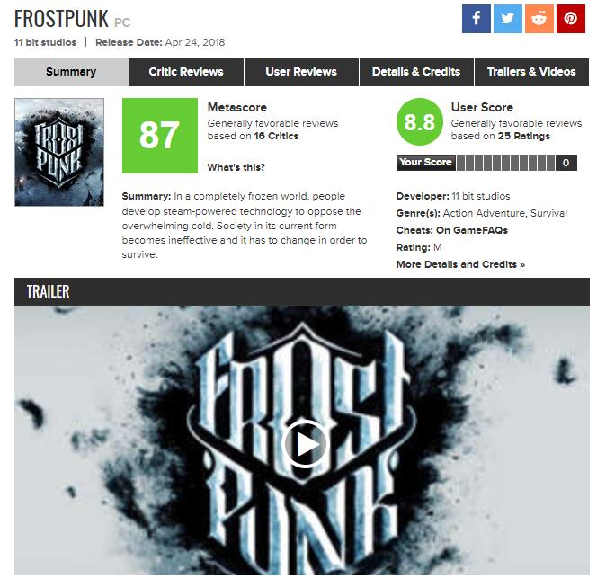 《冰汽时代》首批评分出炉,MC平均分87