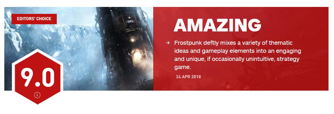 IGN今日为《这是我的战争》开发团队11 Bit新作《冰汽时代》给出了9分的评价。IGN表示《冰汽时代》游戏玩法独特而多样,结合了城市建设和生存游戏的最佳方面。故事非常有趣,可以根据玩家的选择采取多种方式行动,所有这一切都通过出色的画面设计得以传达出来,游戏背景的冰冻荒地比期望中更具吸引力。并且游戏中提出的道德难题,迫使你需要在平衡个体需求和城市生存两方面作出艰难选择。