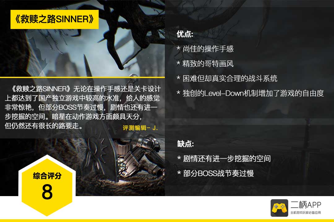 整体来说,《救赎之路SINNER》给人的感觉非常惊艳,无论是操作手感还是关卡都具备了较高的素质,但部分BOSS节奏过慢,剧情也还有进一步挖掘的空间。暗星在动作游戏方面颇具天分,但仍然还有很长的路要走。