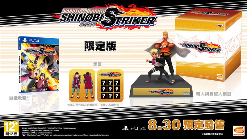 Bandai Namco宣布PS4《火影忍者博人传:新忍出击》繁体中文版将于2018年8月30日同步发售,豪华版将包含游戏本体、季票(内含妙木山两大仙人蛤蟆饰品与9个DLC组合包,DLC内容将于未来陆续公开)以及鸣人&博人的手办模型。