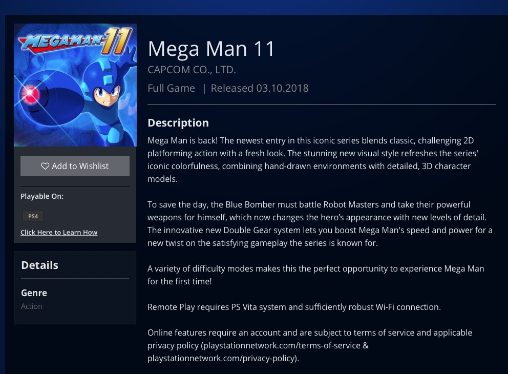 在去年年末,我们从卡普空的官方直播活动中了解到了《洛克人11》将在今年(2018年)年内推出,而今天PSN新加坡服则意外出现了这一新作的详情页面,在该页面的介绍中我们了解到,本作依然是2D平台跳跃,游戏中的角色模型将会以3D形式呈现,同时游戏中还会引入一个全新的“双装备系统”(Double Gear system),这一系统可以在需要的时候提升洛克人的速度以及力量,并给玩家带来更好的游戏体验,在该页面中《洛克人11》的发售日期还被标注为10月3日。