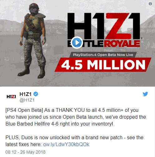 目前“大逃杀”游戏市场已经被《绝地求生》和《堡垒之夜》占据。而作为最早的一批同类型游戏,《H1Z1:大逃杀》也试图找回自己曾经的辉煌。近日该作的PS4版开启了免费游玩,立刻吸引到玩家们的注意。官方今日宣布PS4版的游戏开启Beta测试后,上线首日就吸引到150万玩家,随手的48小时内又共计有超过450万玩家上线体验,这相当于两天内的玩家数量提升了200%。此外官方还加大了更新的力度,根据玩家的需求新补丁还加入了双人组队等实用功能。