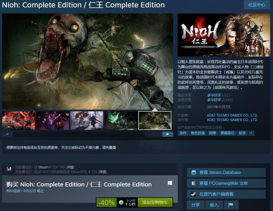 Steam《仁王 年度版》6折优惠史低价149元,准备好落命了吗?