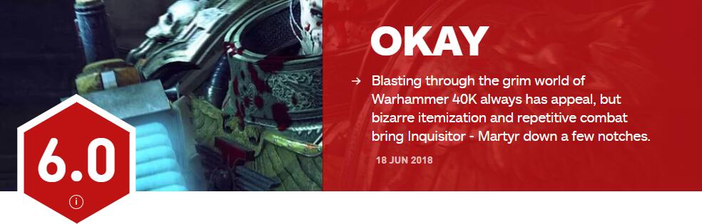 IGN今日为《战锤40K:审判官-殉道者》给出了6分的一般评价。IGN认为本作在许多方面都做得不错,唯独丢失了一部动作RPG最核心的元素。游戏的战斗重复度高,容易枯燥。而且角色能力的提升主要依靠装备而不是属性。IGN把这一点比作造在腐烂地基上的摇摇欲坠的漂亮房子。大家认为一部动作RPG游戏的角色应该依靠装备还是属性来提高能力呢?《战锤40K:审判官-殉道者》将于7月5日登陆PS4及Xbox One平台。