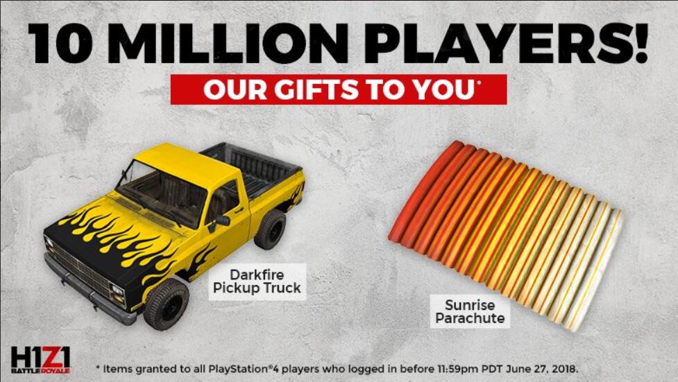 《H1Z1:大逃杀》自从5月份在PS4平台开启测试以来一直热度不减,5月底就已经吸引到450万玩家加入战场。而近日官方宣布在PS4平台游戏的玩家数量已经超过了1000万。为庆祝这一里程碑,游戏将为6月27日之前登陆游戏的玩家免费送出“日出”降落伞皮肤和“暗火”皮卡。
