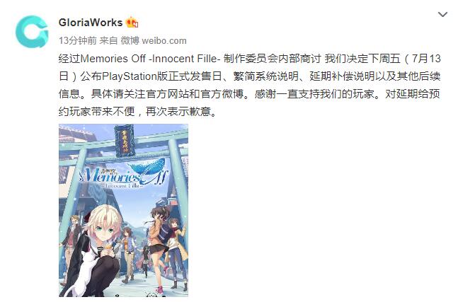 此前《秋之回忆》系列由于商标相关问题,系列中文译名确定将改为《告别回忆》,因此导致最新作《告别回忆 无垢少女》中文版发售日期将相应延期。对此,发行商GloriaWorks今日表示,将在下周五(7月13日)公布《告别回忆 无垢少女》PS4/PSV中文版的正式发售日、繁简系统说明、延期补偿说明以及其他后续信息。