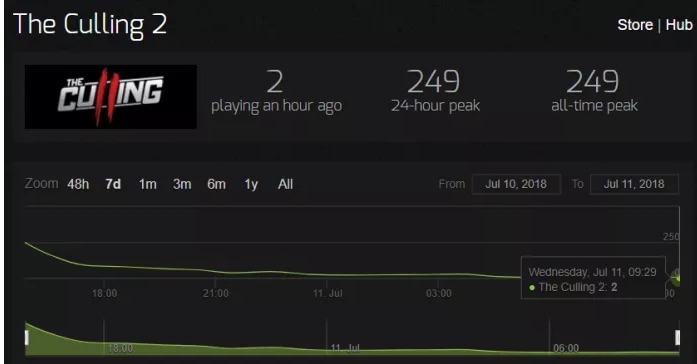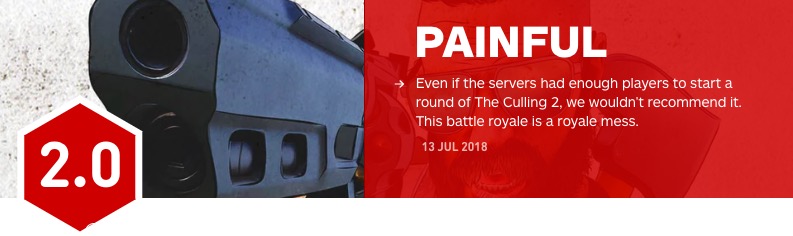 大逃杀游戏《淘汰2》于昨日下午正式推出,但不到一天玩家人数便跌至可怜的2人。IGN今日同样毫不留情地为本作给出了2分的极低评价,认为“即便有足够的人数开启一场游戏,我们也不推荐,这游戏简直太糟糕了。“初代《淘汰》于2017年推出,是早期的大逃杀游戏之一,而本次发售的《淘汰2》完全没有任何的改变,仅仅是添加了更多的装备、武器等。玩家纷纷对此表达自己的失望和不满。游戏在Steam上发布后不久,达到了249名玩家的最高点。 但在18个小时后,该游戏便仅存2名玩家。大家将这个游戏视为近代游戏的一场灾难。