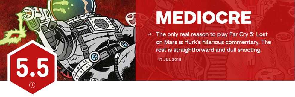 IGN今日为《孤岛惊魂5》的DLC“迷失火星”给出了5.5分的评价。IGN认为把DLC的背景设置在火星是一个奇怪的选择。“迷失火星”中描绘了一个有趣的角色(Hurk),要是游戏的玩法也和对话和枪支的名称一样有创意就好了。和蒙大拿的风光比起来,这款火星之旅实在不能称得上有趣。即使有喷气背包、激光武器和外星异虫这些元素,火星对于玩家来说仍然是一块赤色荒漠。总结,只有Hurk的风趣评论让游戏值得一试,剩下的内容就只有简单枯燥的突突突。
