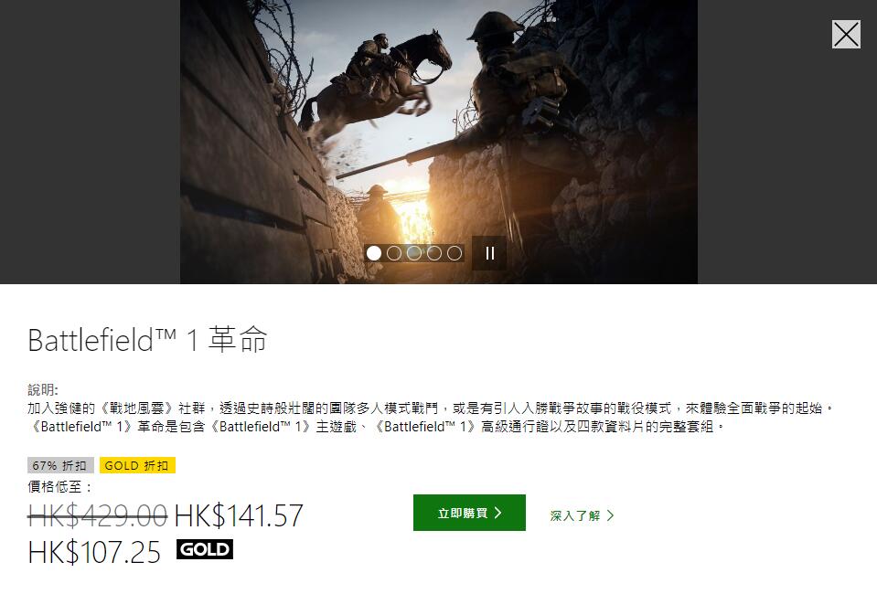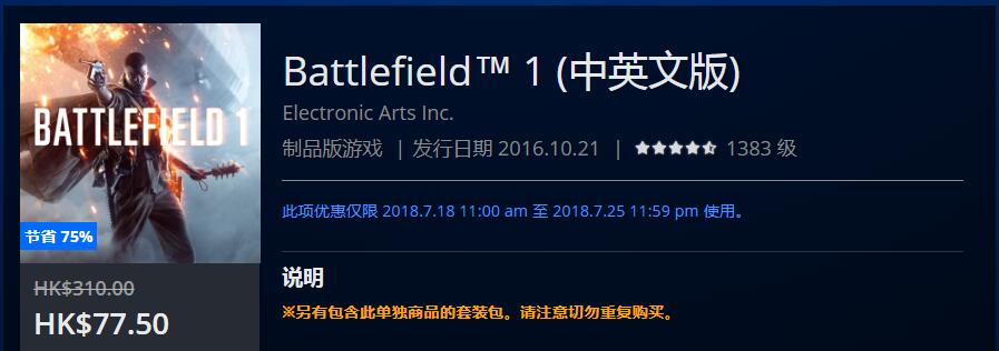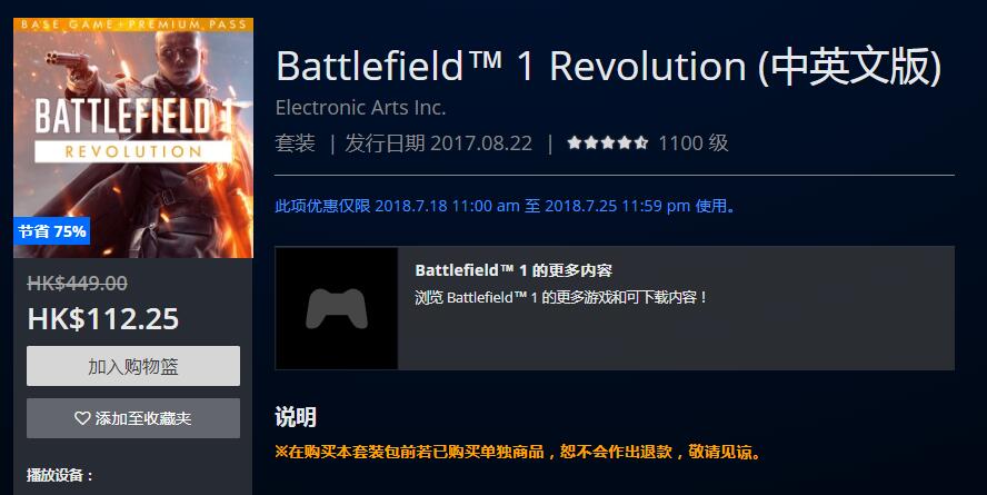 港服PSN/Xbox Live商店开启《战地1》优惠活动,最低价仅售77.5港币!