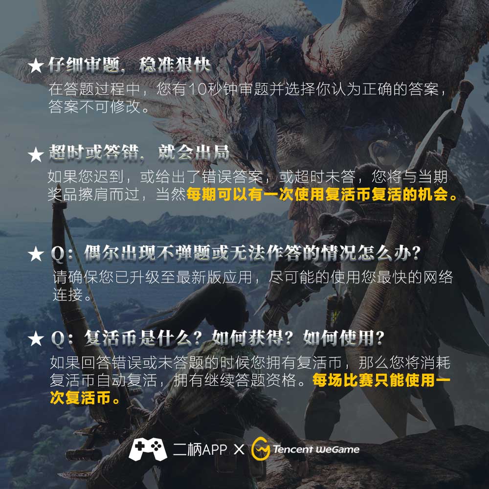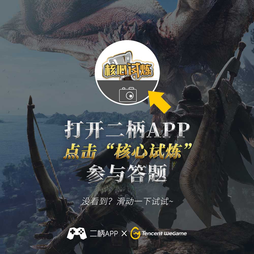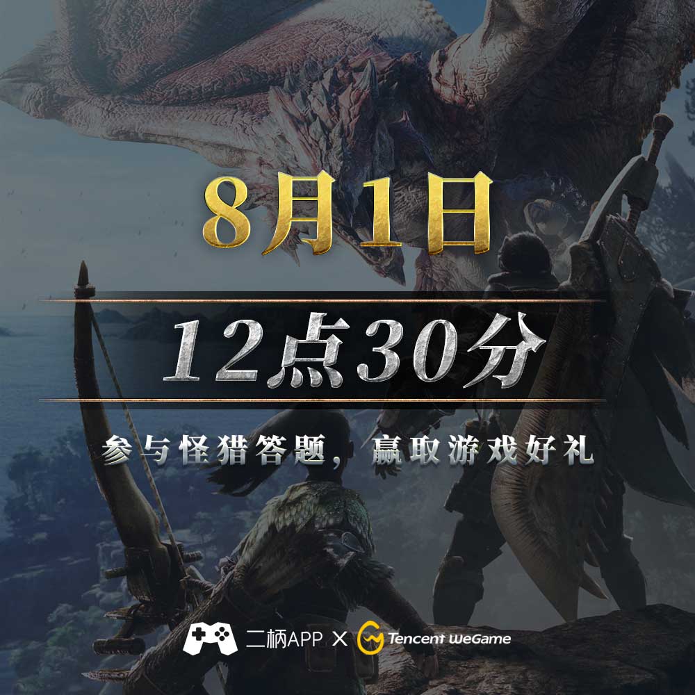 #猎人试炼,寻找中国最强怪猎粉丝# 《怪物猎人:世界》自发售以来获得了全球玩家以及媒体的一致好评,游戏更是已经刷新了卡普空官方的游戏销售记录,使全球MH粉丝们为之疯狂!而如今,为庆祝《怪物猎人:世界》即将登陆WeGame,最新的一期二柄“核心试炼”《怪物猎人:世界》答题专场(本周三 8月1日中午12:30),我们特别联合了WeGame为怪猎粉丝们准备了超量的好礼!与往常一样,通过层层考验战至最后10位或10位以内的玩家将会平分最终奖品(3000 Q币:可用于WeGame平台游戏消费)!而即使无法获得最终的大奖,我们也准备怪猎粉们准备了精美的怪猎专属头像框,只要参加答题即有机会赢取!详细活动时间、规则、以及奖品请见下图。