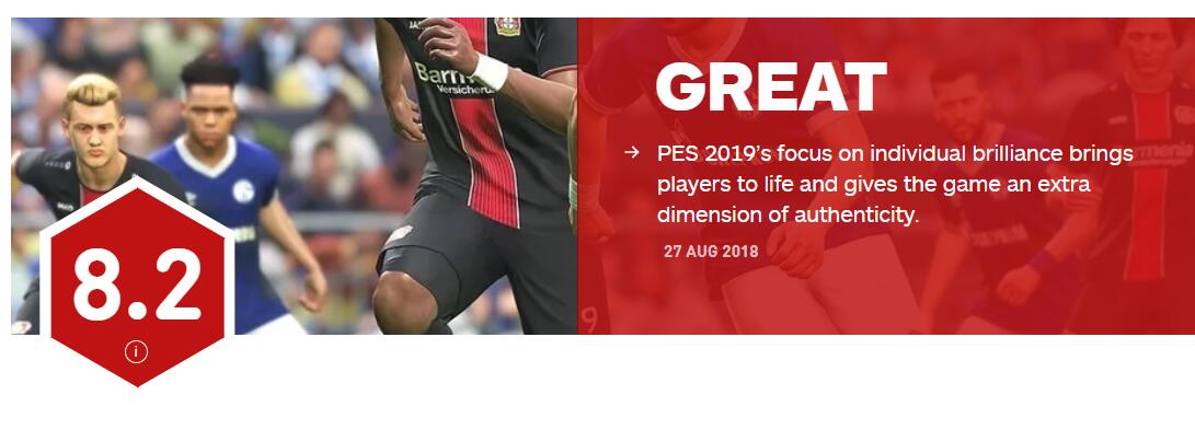 IGN今日为《实况足球2019》给出了8.2分的优秀评价。IGN评测编辑表示,《实况足球2019》的新增游戏模式以及对原有模式的修改内容并不足以吸引玩家购买,而其正在值得玩家购买的关键是游戏中对于球员角色的个性刻画,为游戏增添了真实性,这与此前系列作品完全不同的。