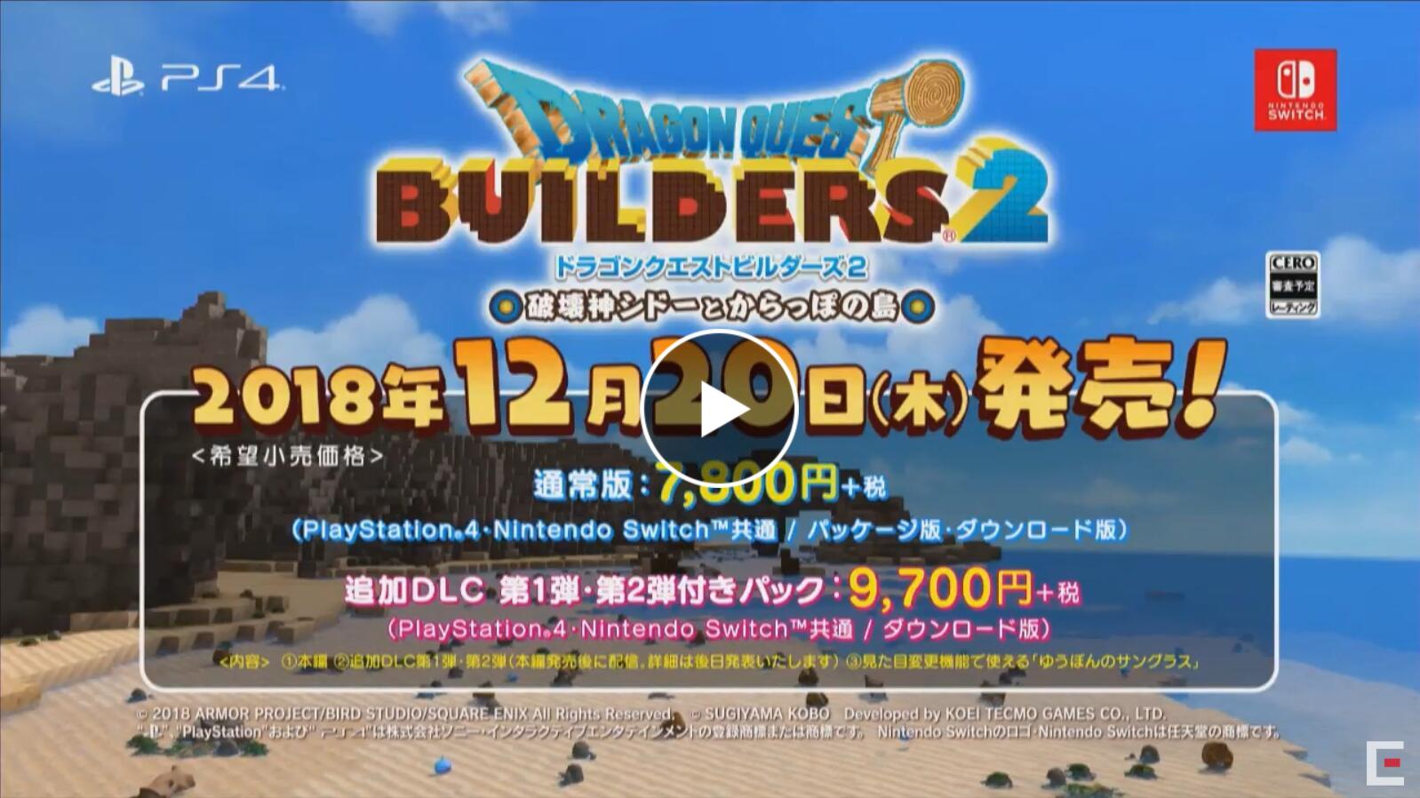 SE在直播活动中公布了《勇者斗恶龙:建造者2》的开场OP。本作标准版售价7,800日元(合人民币约478元),包含两款DLC内容的数字捆绑版售价9,700日元(合人民币约595元)。本作的高度限制扩展到了前作的3倍,同时还将加入第一人称视角、水中冒险等新内容。游戏将于12月20日登陆PS4及Switch平台。