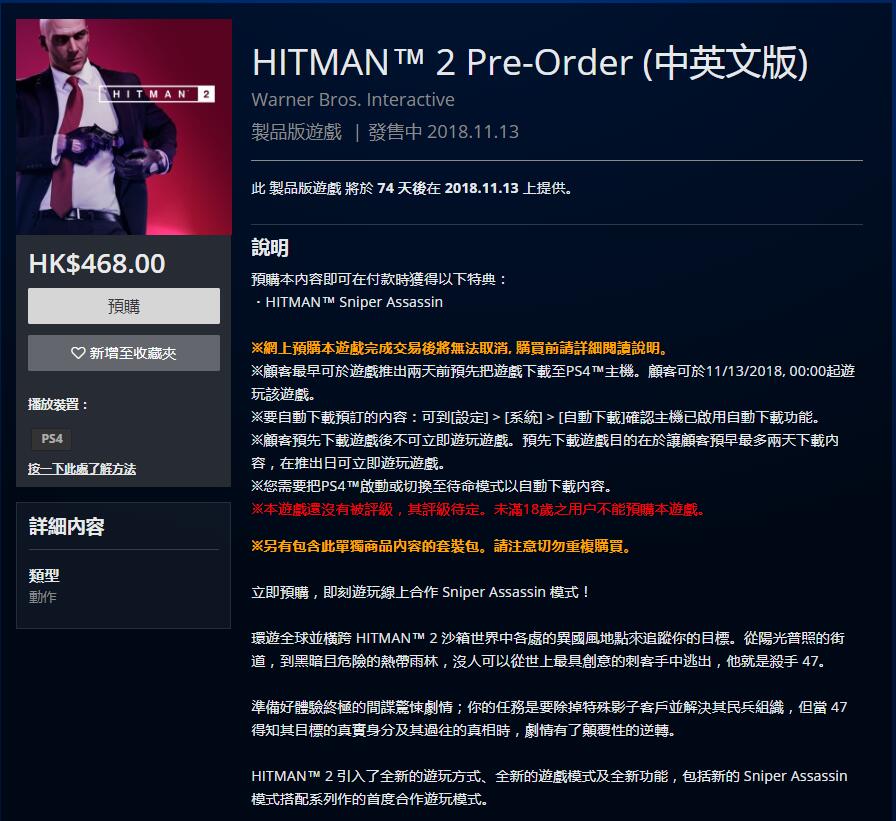 放心了!PSN商店预购页面显示PS4《杀手2》将支持中文