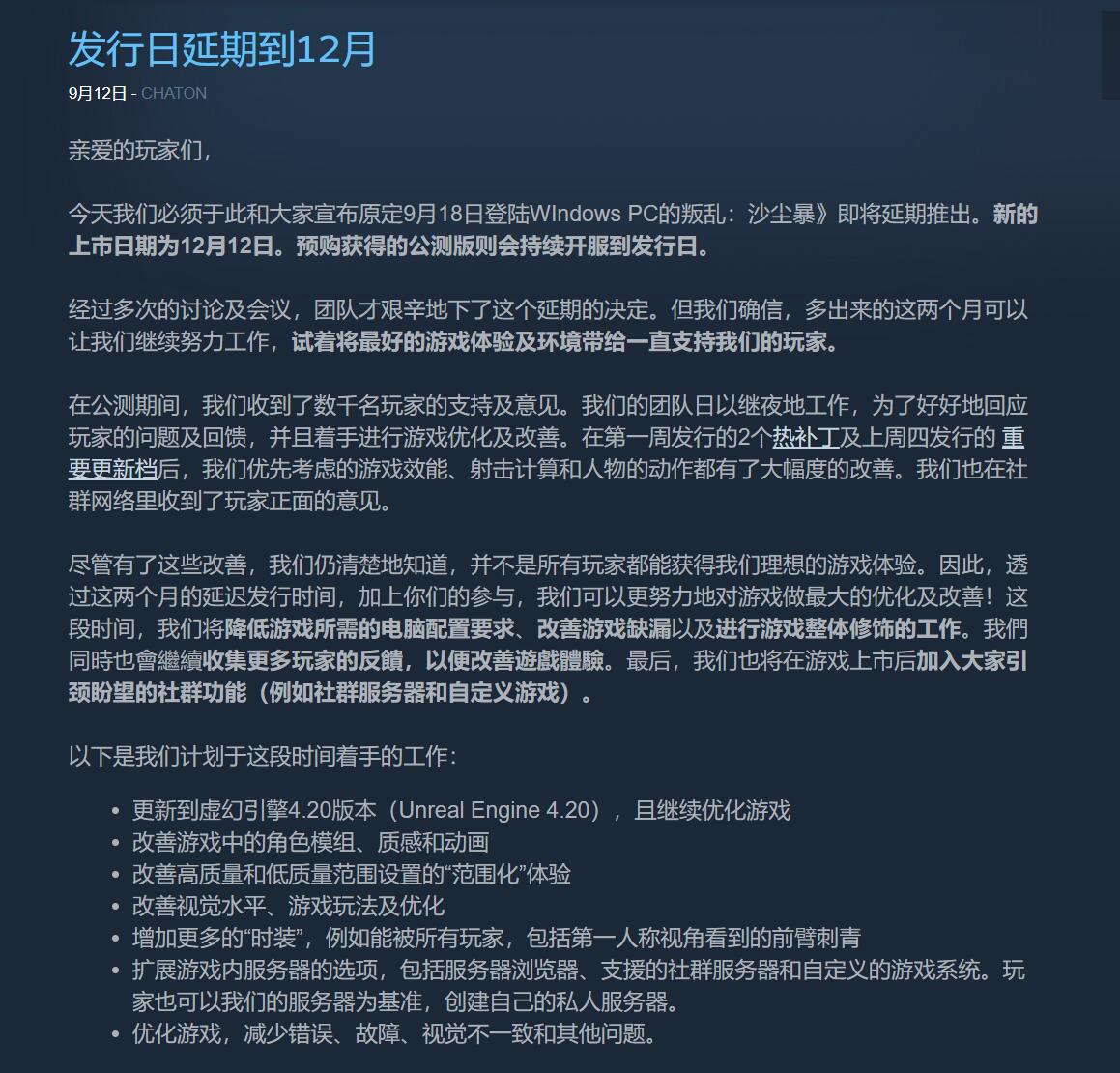 发行商Focus Home Interactive今日宣布,《叛变 沙漠风暴》PC版发售日期由原定的9月18日延期至12月12日发售。延期原因为最近的测试版游戏收到了数千名玩家的支持以及反馈,为了更好地回应玩家的问题及回馈,开发商希望有更多时间来改进游戏体验,并着手进行游戏优化及改善。此外玩家预购获得的Beta测试版则会持续开服到游戏发售。