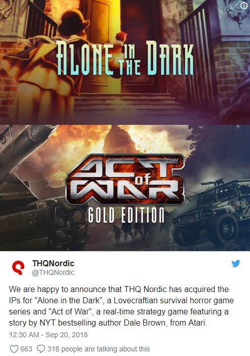 THQ Nordic从雅达利手里收购了《鬼屋魔影》《战争行为》两个IP