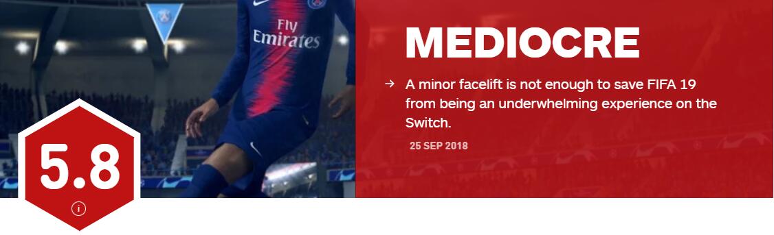 Switch《FIFA 19》获IGN 5.8分一般评价,“老旧”的核心 “翻新”的皮