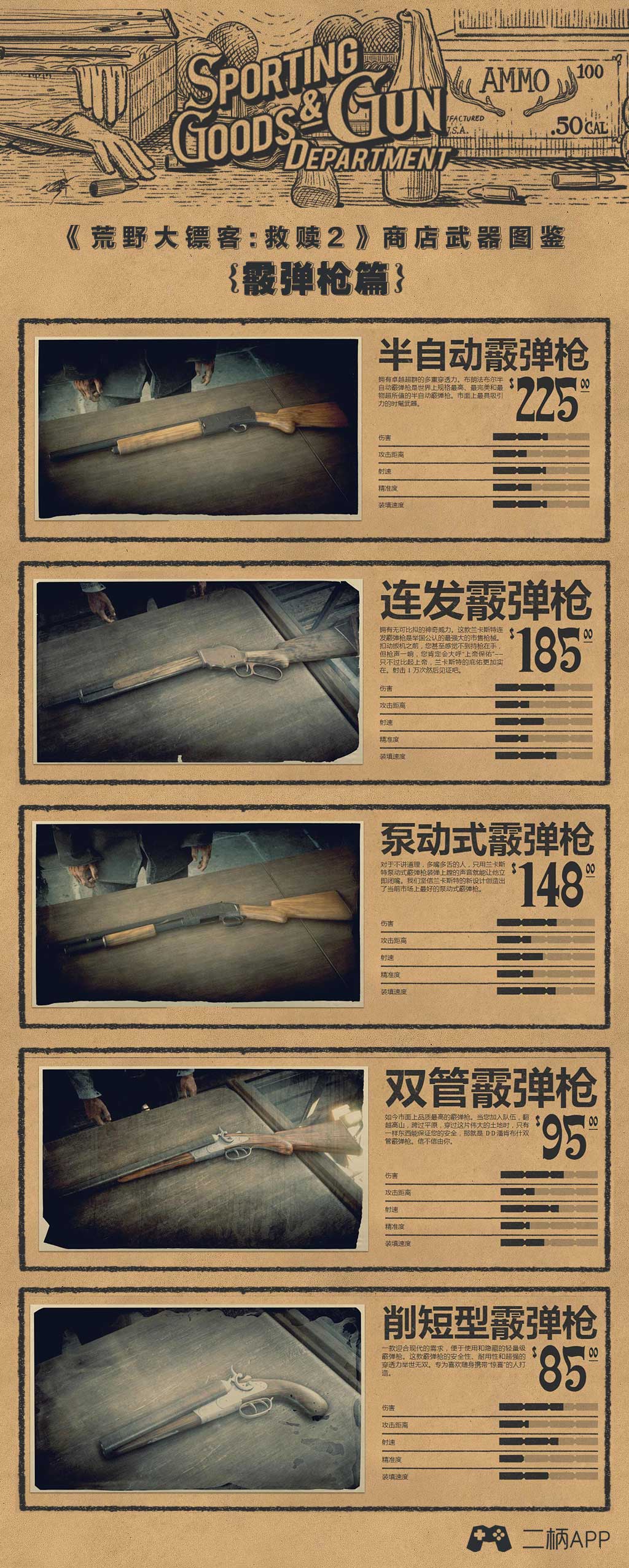 《荒野大镖客:救赎2》发售一天,你都拿到多少武器了?我们带来了游戏中商店贩售的枪械武器图鉴,从手枪到霰弹枪再到步枪总计19把武器,每把枪都附有详细的武器数据。同时我们将每把武器的数据作了一番对比,来看看我们的推荐吧。手枪方面,火山手枪无论是在伤害还是精准度方面都有不错的表现,如果你对射速也有要求的话,斯科菲尔德左轮也是不错的选择。霰弹枪方面我们没有太多的选择,但双管霰弹枪极高的伤害和射速绝对能让你制霸近距离战场。步枪方面,兰卡斯特连发步枪各方面的均衡性较高,一定适合刚来到西部世界的你。对自己的枪法很自信?那就试试栓式步枪吧!