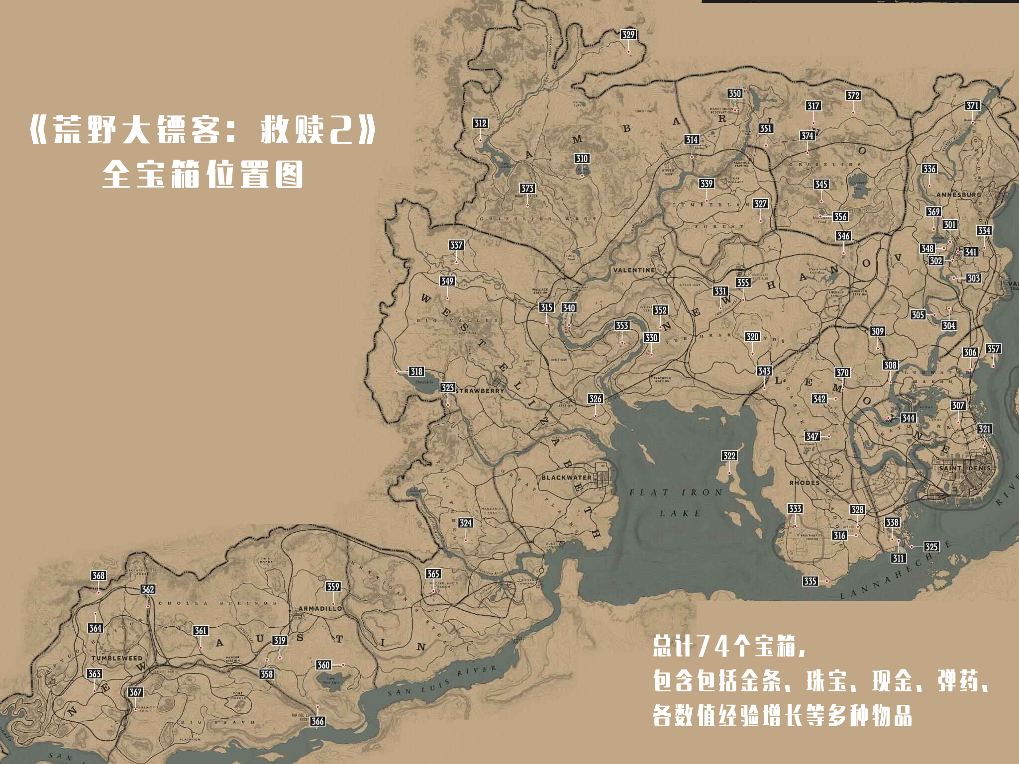 看!是宝藏!《荒野大镖客:救赎2》的地图中总计分布了74个宝箱供玩家发现,而这些宝箱中则拥有着包括“金条、高级珠宝、大量现金、消耗品、各数值经验消费品”等诸多宝贝,可以为牛仔们的冒险生涯提供大量帮助。大部分的宝箱都在地图所示位置的房屋中,玩家们可自行探索进行寻宝。该地图截选自《荒野大镖客:救赎2》官方英文攻略本,祝各位发财!