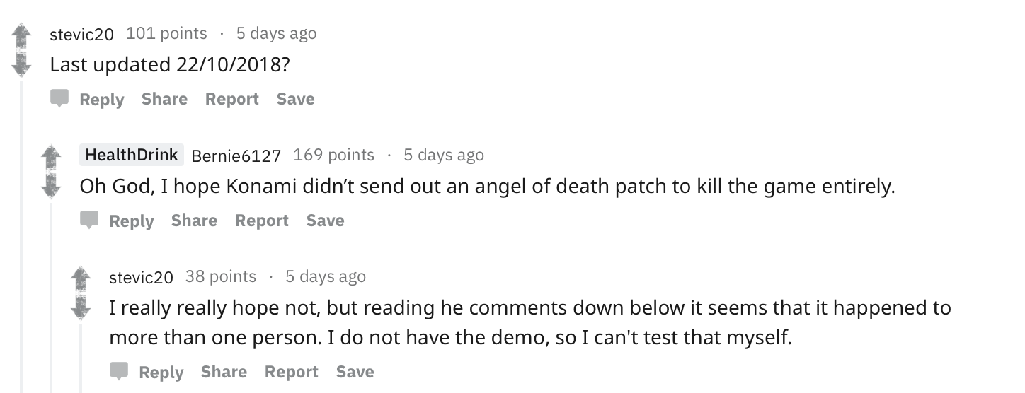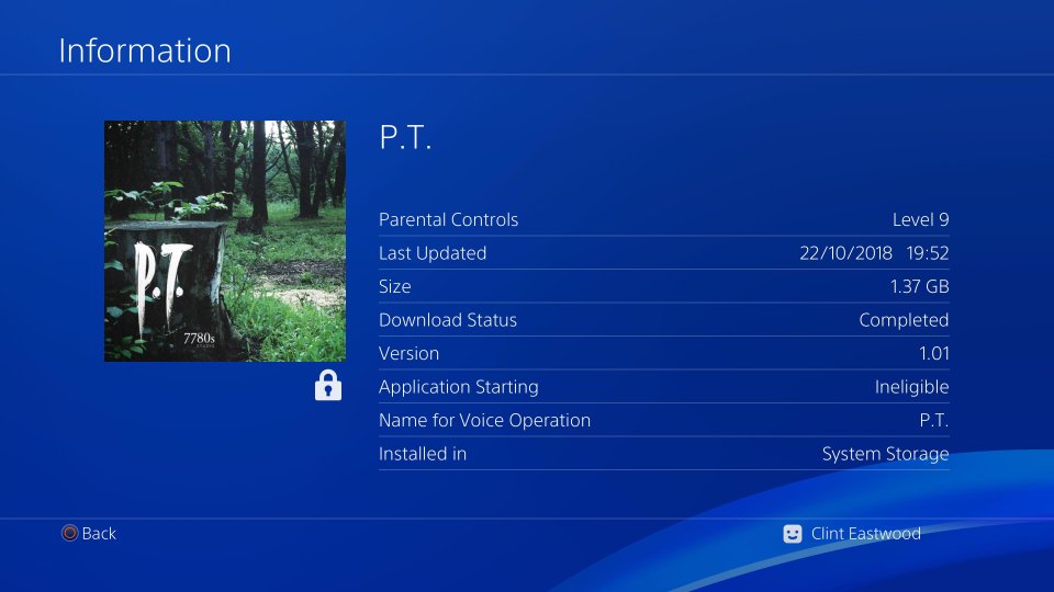 最近有玩家在Reddit上发帖表示,他PS4主机里装好的《寂静岭P.T》游戏居然在2018年10月22日收到了一次1.01版本更新,而更新之后游戏就完全无法正常启动了。不过到目前为止还没有其他玩家反映与他相似的情况,并且版本号也停留在1.00上,但是这位玩家的截图中时间的格式是日/月/年,所以并不排除是某些地区专门推送补丁的可能性。目前多位各个地区的玩家和外媒IGN经过测试都暂时没有收到任何类似的补丁,我们也会跟进这一情况进行后续报道。